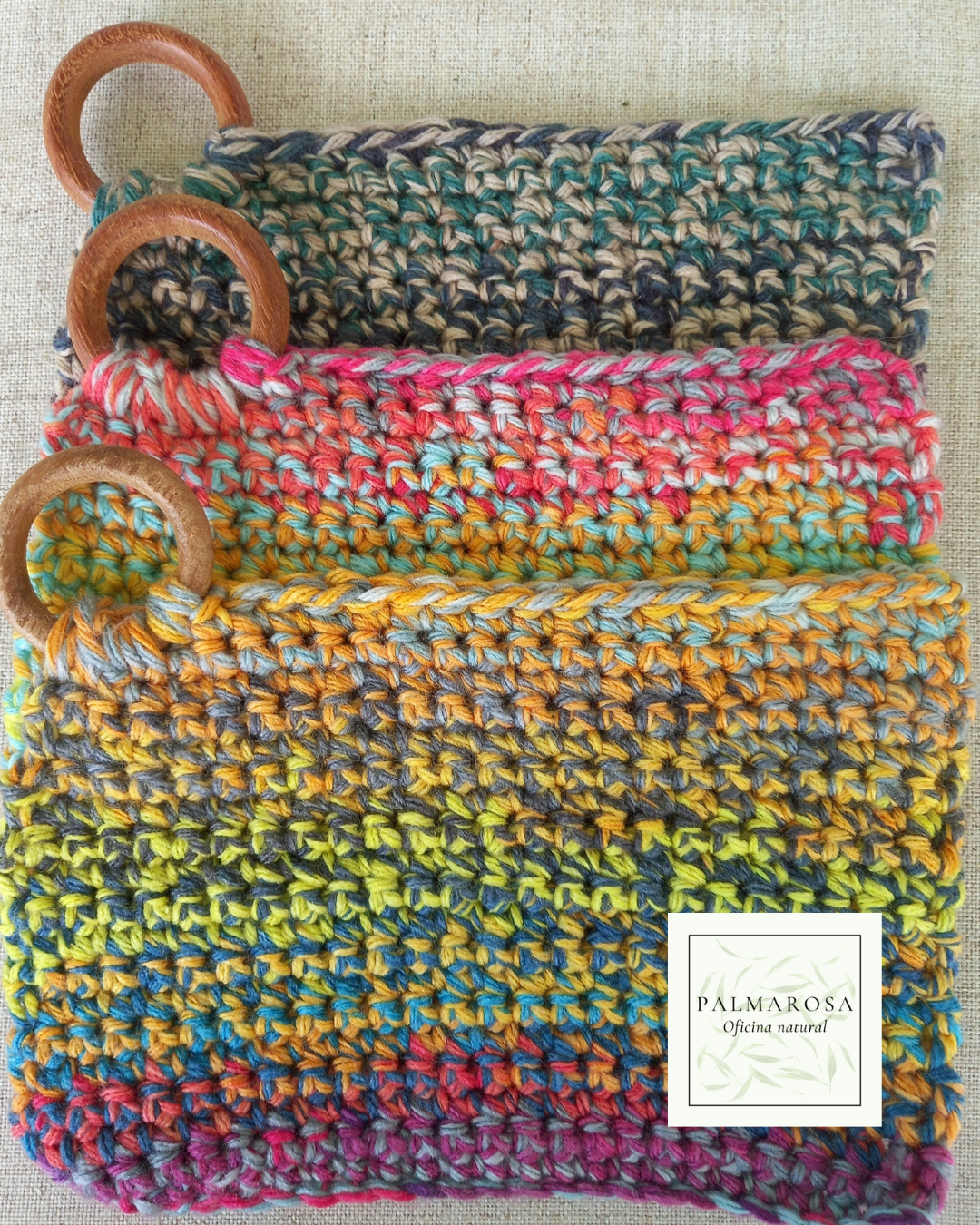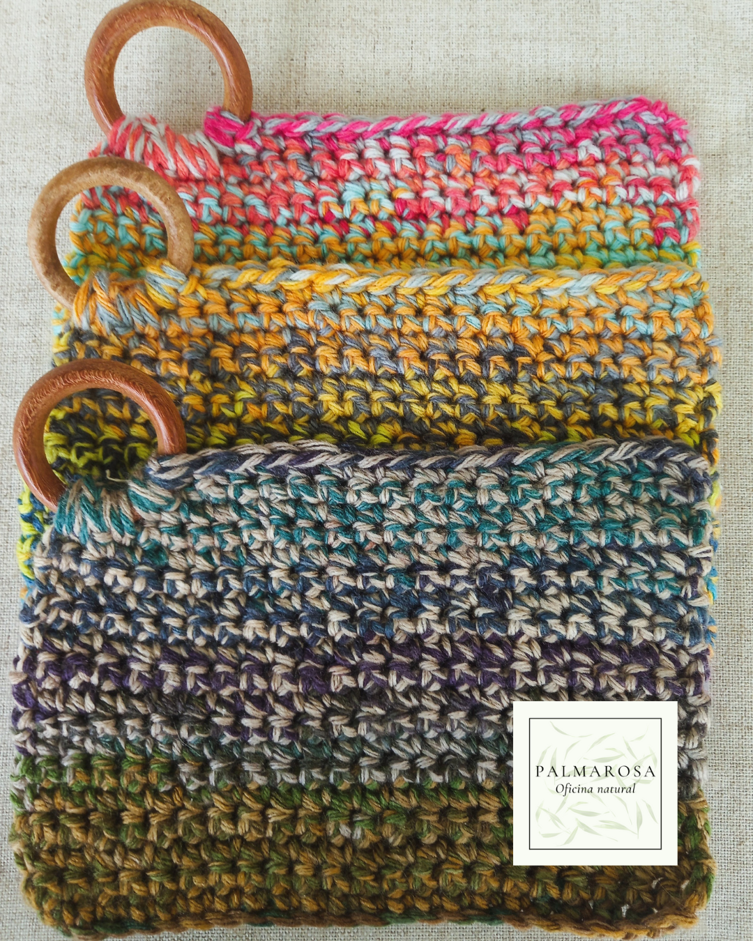 Crochê firme, confeccionado com fios de algodão e fibras recicladas, garante proteção térmica e durabilidade, enquanto a argola de madeira natural adiciona charme e praticidade — perfeita para pendurar na cozinha e deixar sempre à mão.