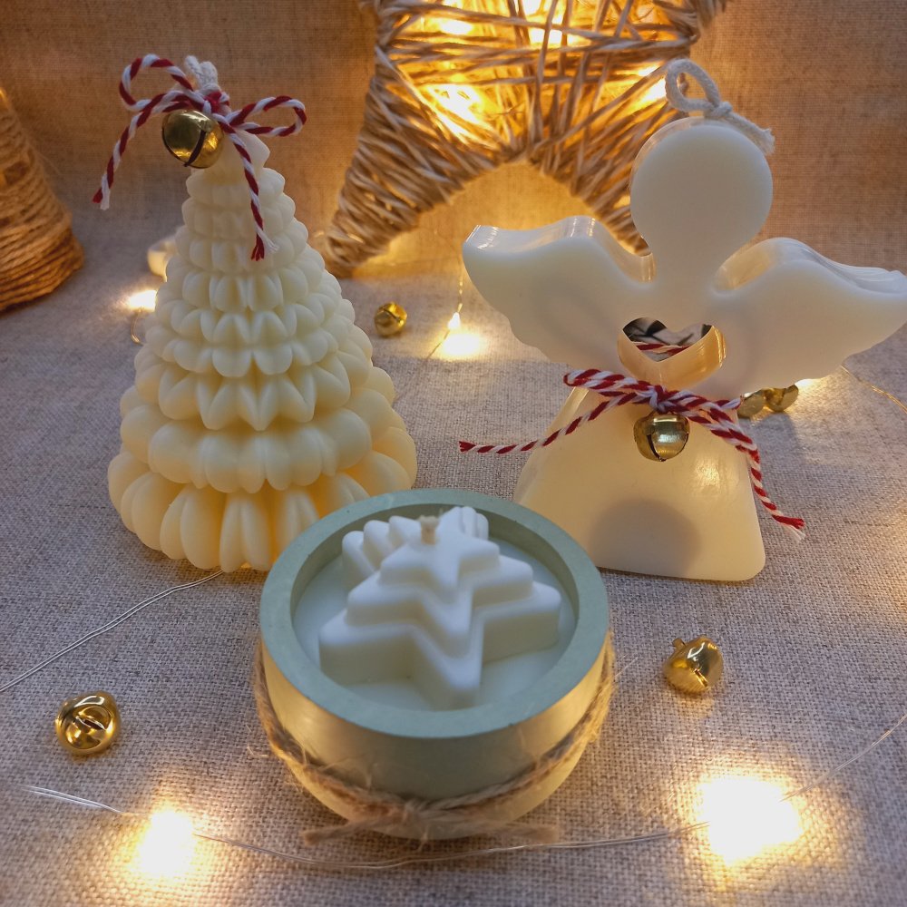 O conjunto reúne uma vela aromática em ecomármore com fragrância de maçã e canela — quente, envolvente e perfeita para a temporada — acompanhada de duas velas decorativas: um anjo e uma árvore de Natal, ambas feitas à mão com cera 100% vegetal e pavio de algodão, garantindo uma queima limpa, sem parafina.