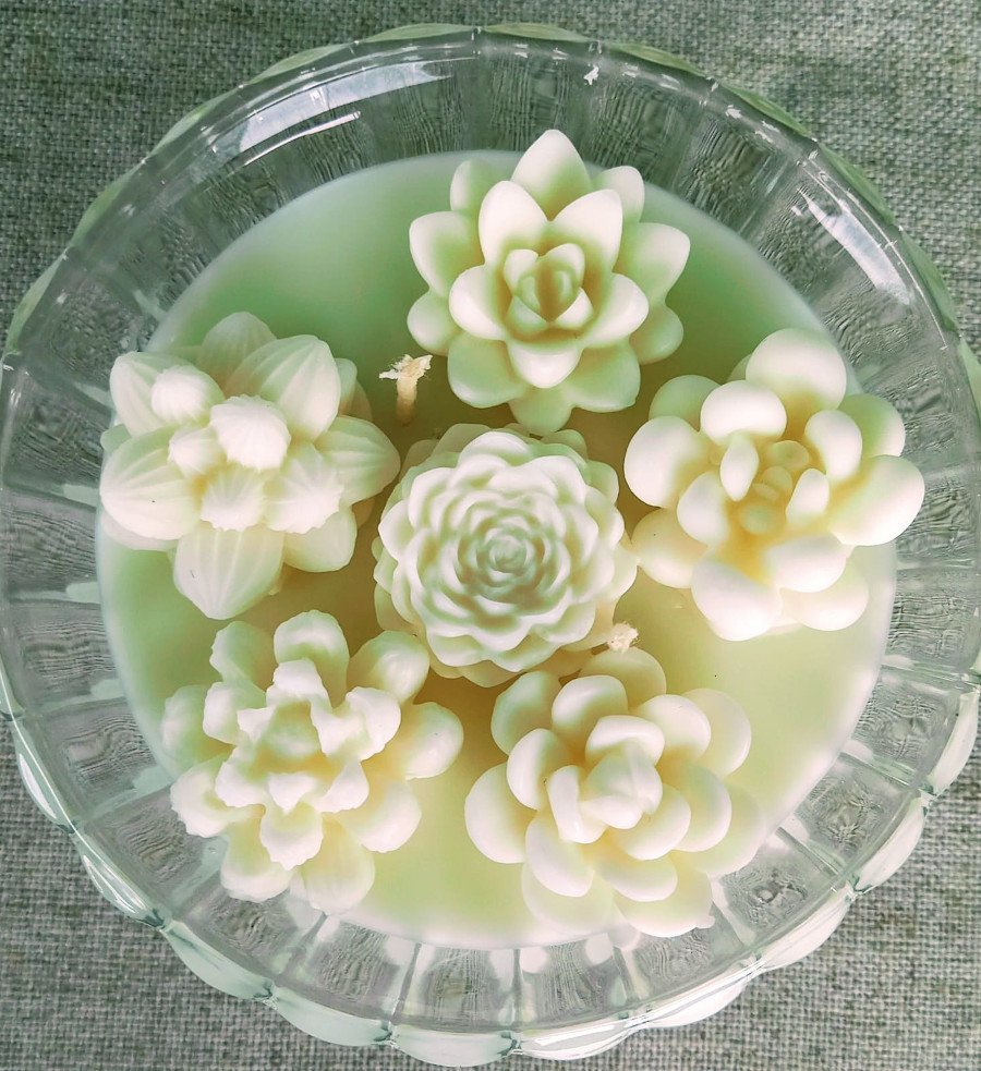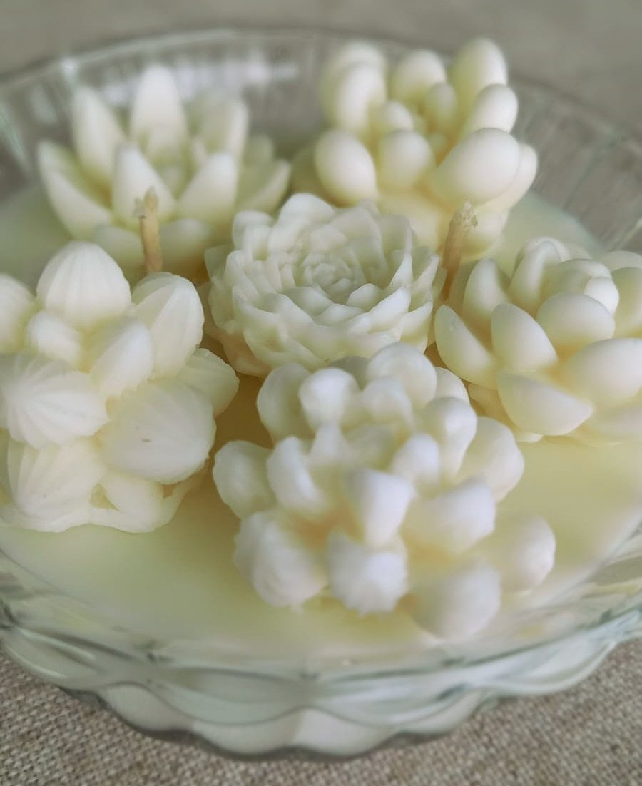 O charme especial está no topo: delicadas mini velas em formato de suculentas, moldadas uma a uma, que trazem textura, beleza e naturalidade à peça. A base em vidro trabalhado completa o visual com um toque vintage e elegante.