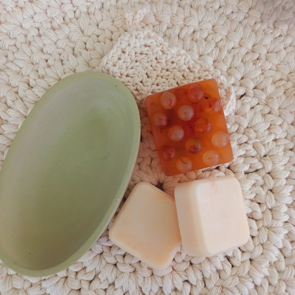 Acompanha uma saboneteira em formato de canoa, feita em EcoMármore, material mineral sustentável de aparência elegante e toque natural, e um ecopad de crochê quadrado, produzido artesanalmente em fio de algodão cru — ideal para complementar a rotina de cuidados diários ou para decorar com charme o ambiente de banho.