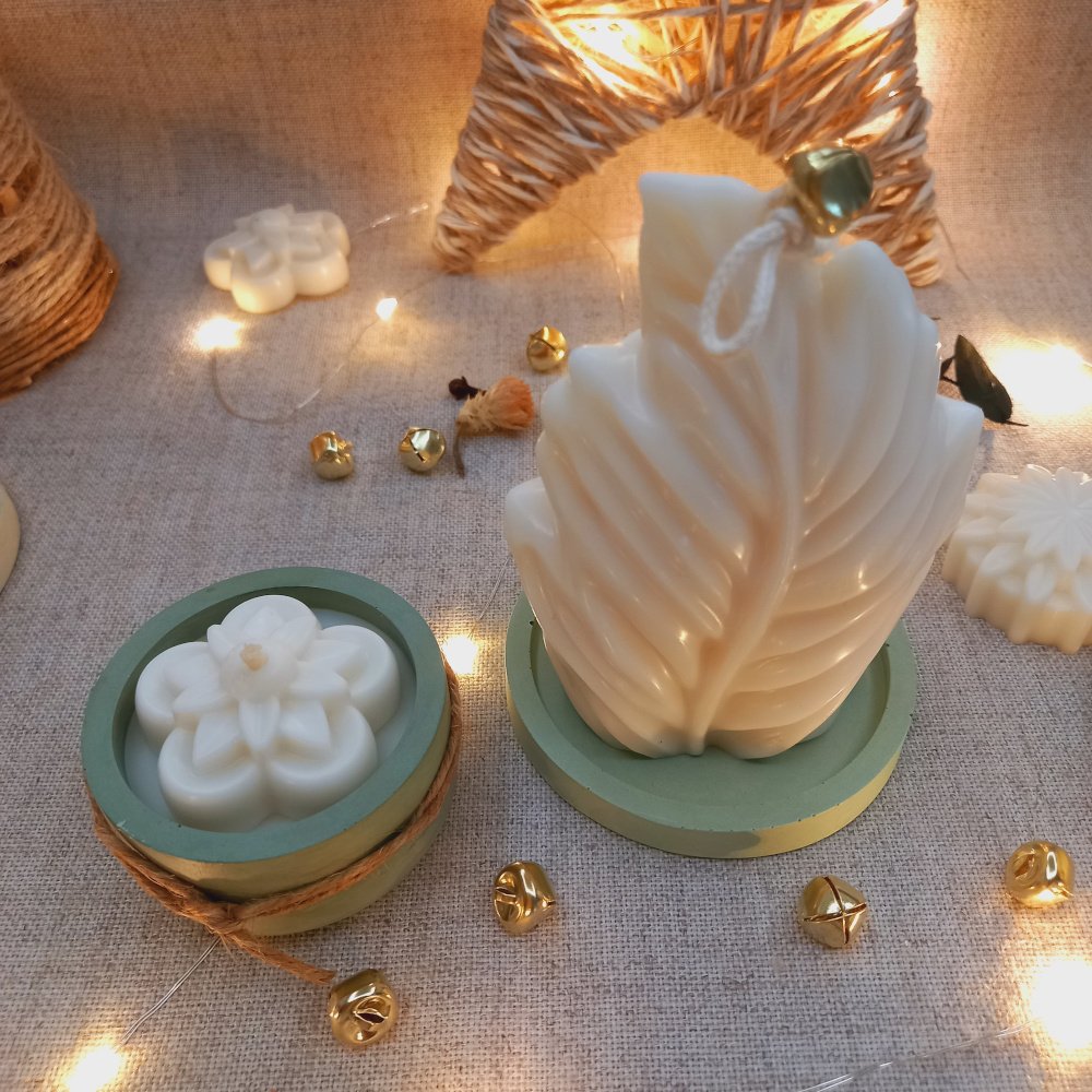 🍃 Vela decorativa em formato de folha, feita à mão, com acabamento delicado e textura natural. Cera 100% vegetal e pavio de algodão.