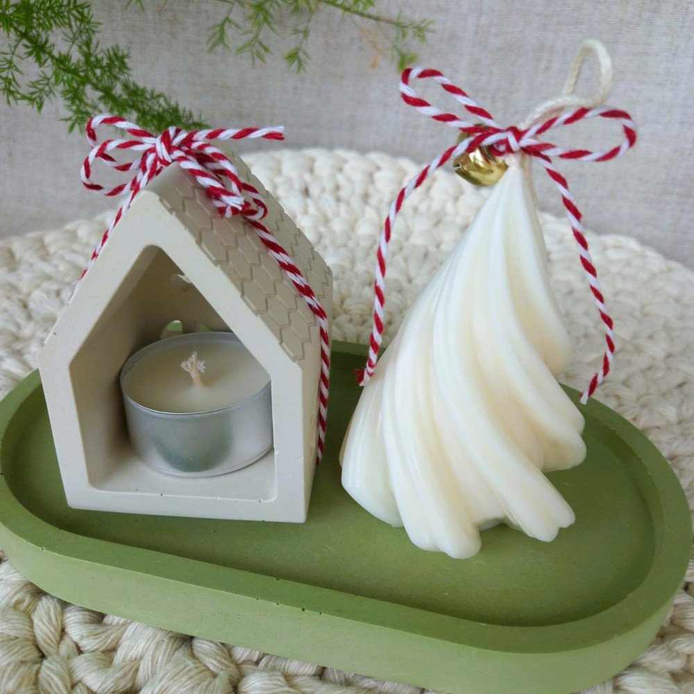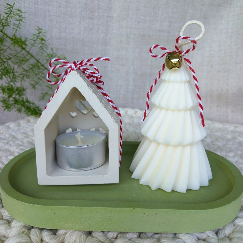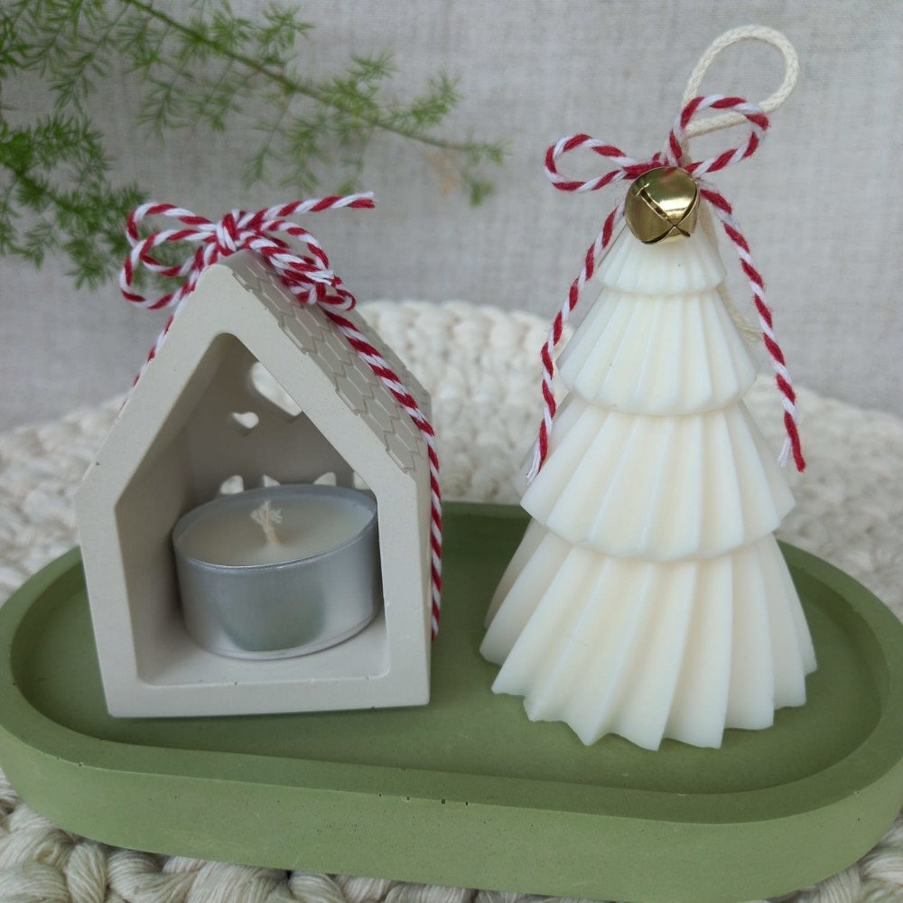 O conjunto é composto por uma casinha porta-vela e uma bandeja em EcoMármore, acompanhadas de uma vela artesanal em cera de coco 100% vegetal, moldada no formato de pinheirinho.