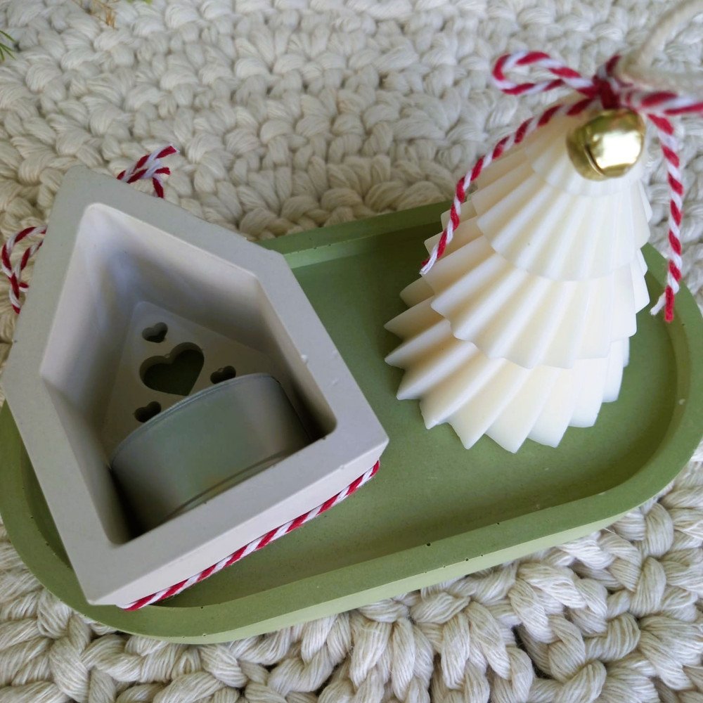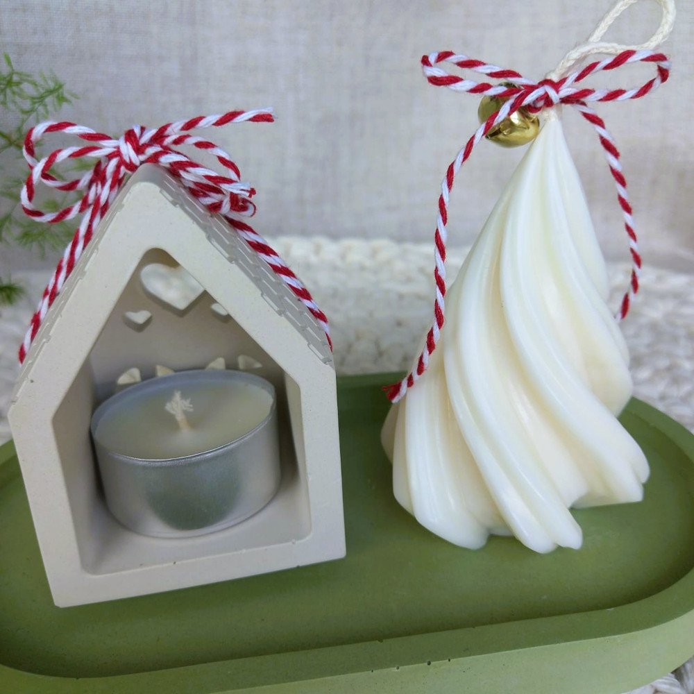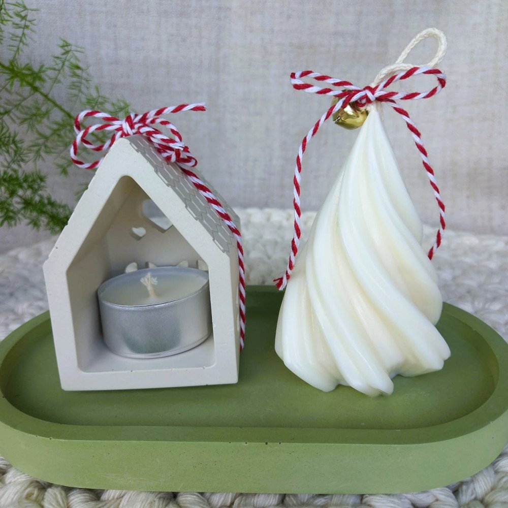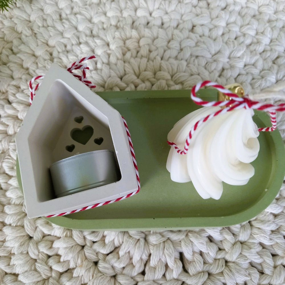 O conjunto é composto por uma casinha porta-vela e uma bandeja em EcoMármore, acompanhadas de uma vela artesanal em cera de coco 100% vegetal, moldada no formato de pinheirinho.